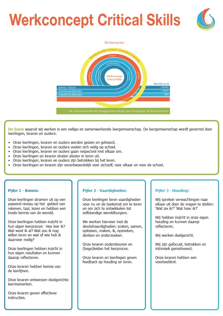 Het is een praktische manier van werken waarmee je bouwt aan een betekenisvolle leeromgeving. In die veilige omgeving is sprake van oprechte betrokkenheid en eigenaarschap. Iedere leerling wordt gezien en gehoord, iedere leerling doet ertoe. De samenwerking tussen leerlingen, leraren en ouders staat voorop. Termen als ‘thuis voelen’, ‘plezier’, ‘respect’, ‘dialoog’ en ‘successen delen’ passen bij het Werkconcept Critical Skills.